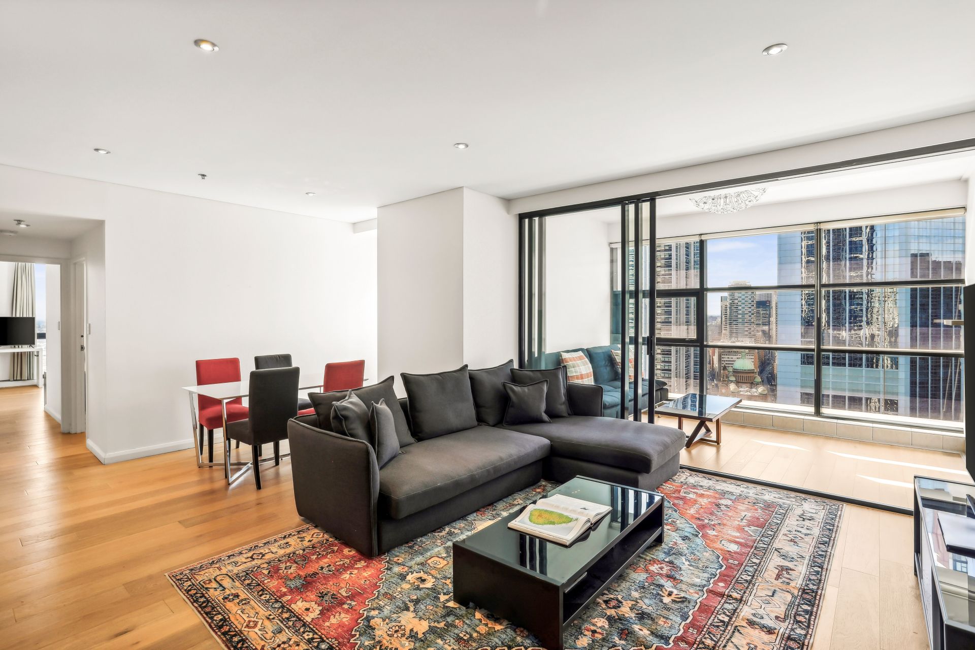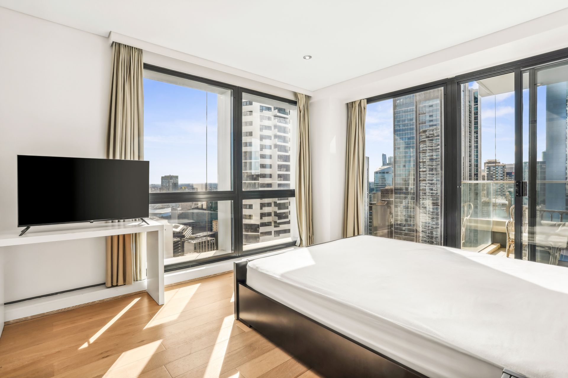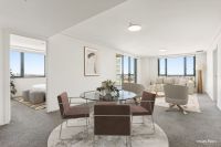 The Apartment - This elegant, fully furnished two-bedroom plus study apartment features a modern kitchen, spacious living and dining area with an abundance of natural north-facing light, and a private balcony with wide-spanning city views. The master bedroom includes an ensuite, while the additional study provides flexibility for work or relaxation.