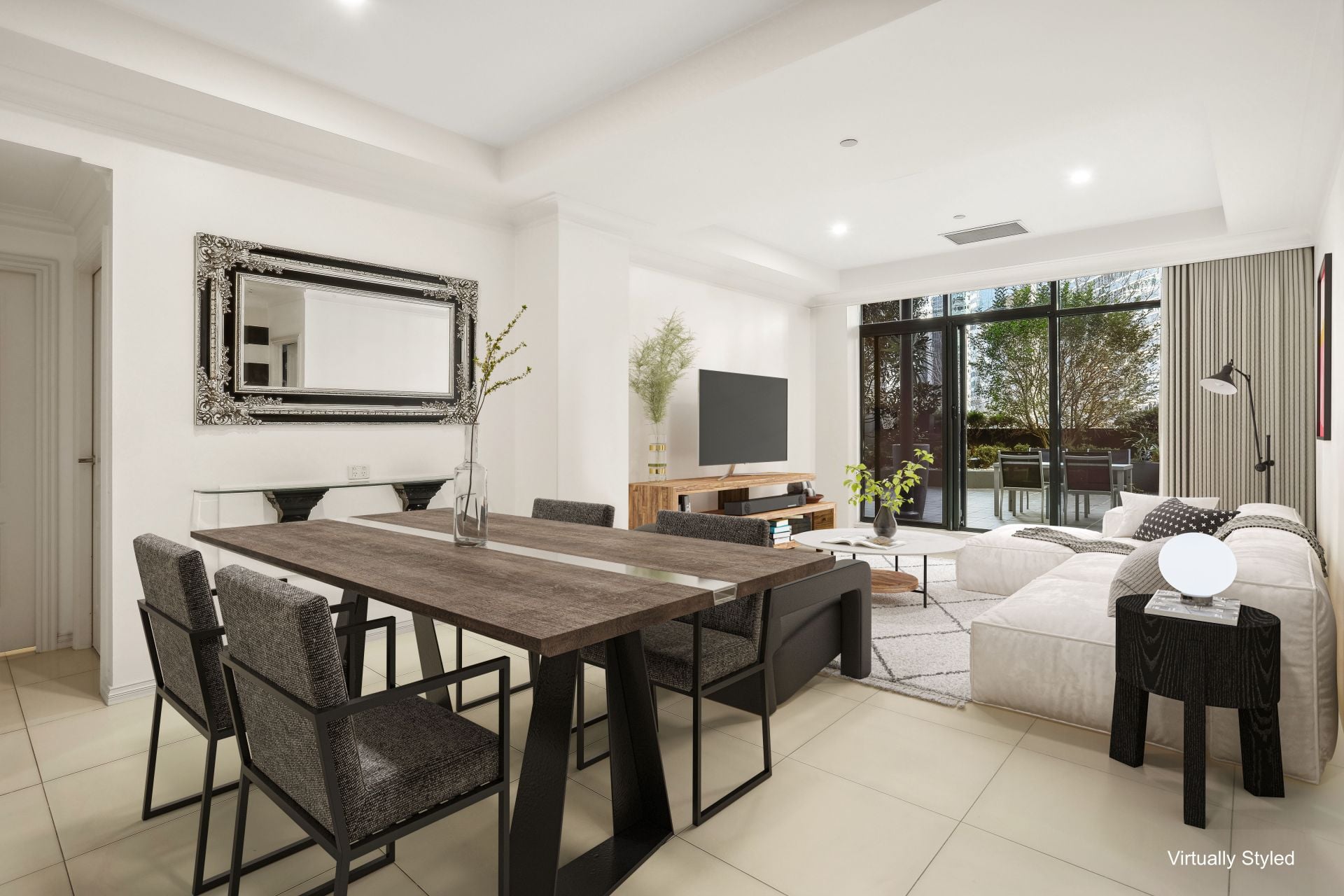 The Apartment - Spacious bedrooms with large glass windows and doors opening to the terrace, a generously sized living and dining area, gourmet kitchen with stainless steel appliances and granite countertops, two luxurious bathrooms, additional study room, internal laundry, and a private outdoor terrace with scenic CBD views and garden areas.