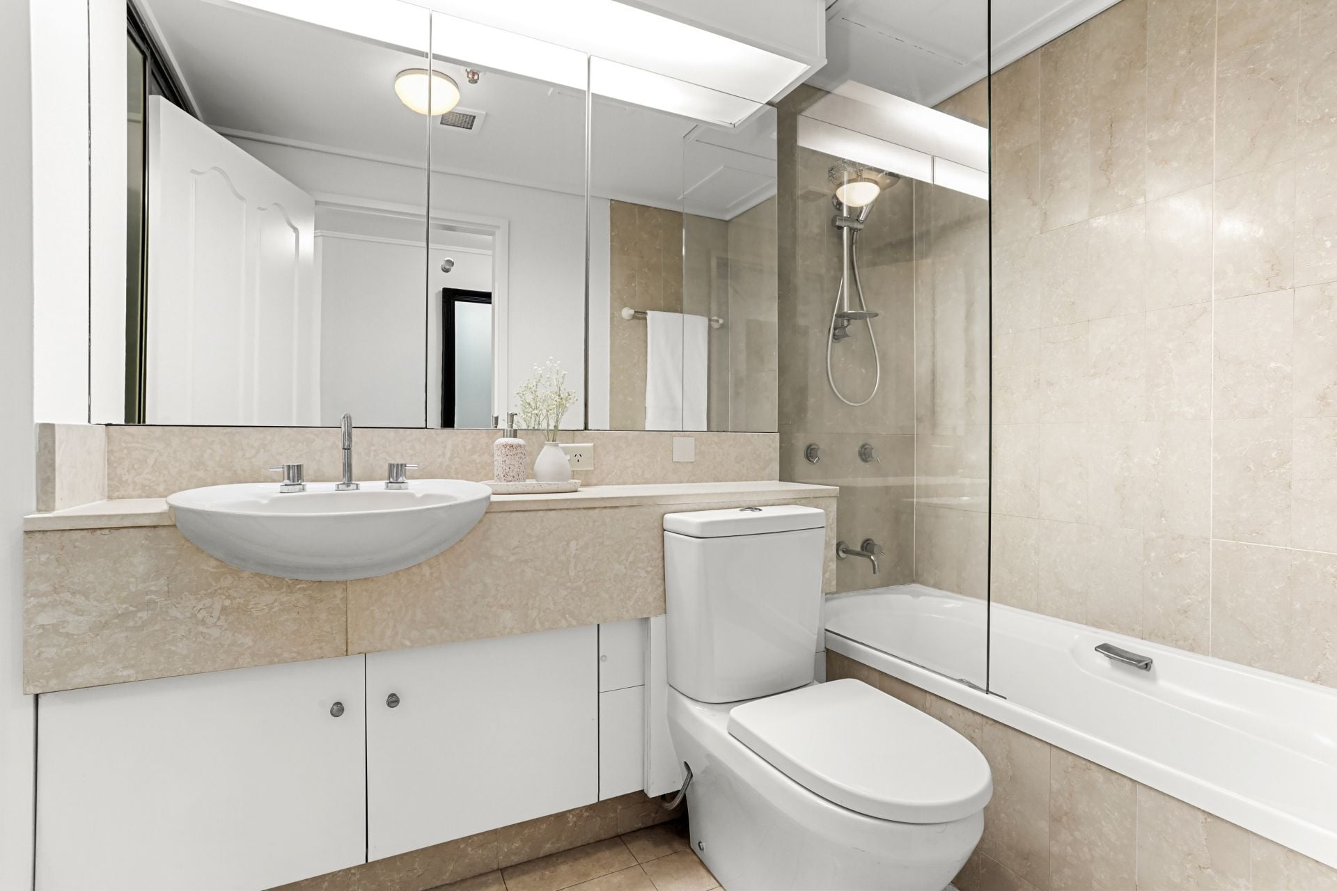- Stylish full-sized bathroom with bathtub